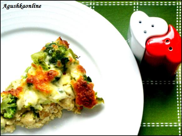 Mięso pokroić w dość dużą kostkę. Skropić olejem i sokiem z cytryny, oprószyć pieprzem i solą oraz curry. Podsmażyć na reszcie oleju. Jajka zmiksować ze śmietaną (mlekiem), dodać starty ser i posiekany czosnek. Brokuł umyć, podzielić na różyczki. Wrzucić na osolony wrzątek i gotować 3 minuty. Kurczaka i brokuły ułożyć w naczyniu żaroodpornym, zalać masą jajeczną. Zapiekać 20 minut w temp. 200 o C.